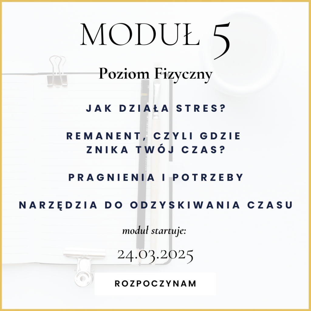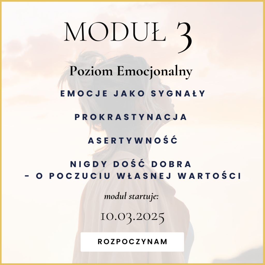 W tym module nauczysz się odróżniać swoje pragnienia od potrzeb. Zrozumiesz na głębszym poziomie jak Twoje myśli kształtują Twój mózg na poziomie neurobiologicznym poprzez połączenie ze stanami emocjonalnymi. To także czas na uwolnienie zakopanych emocji powiązanych z czasem i obowiązkami. Oswoimy Twoje emocjonalne tygrysy 🙂