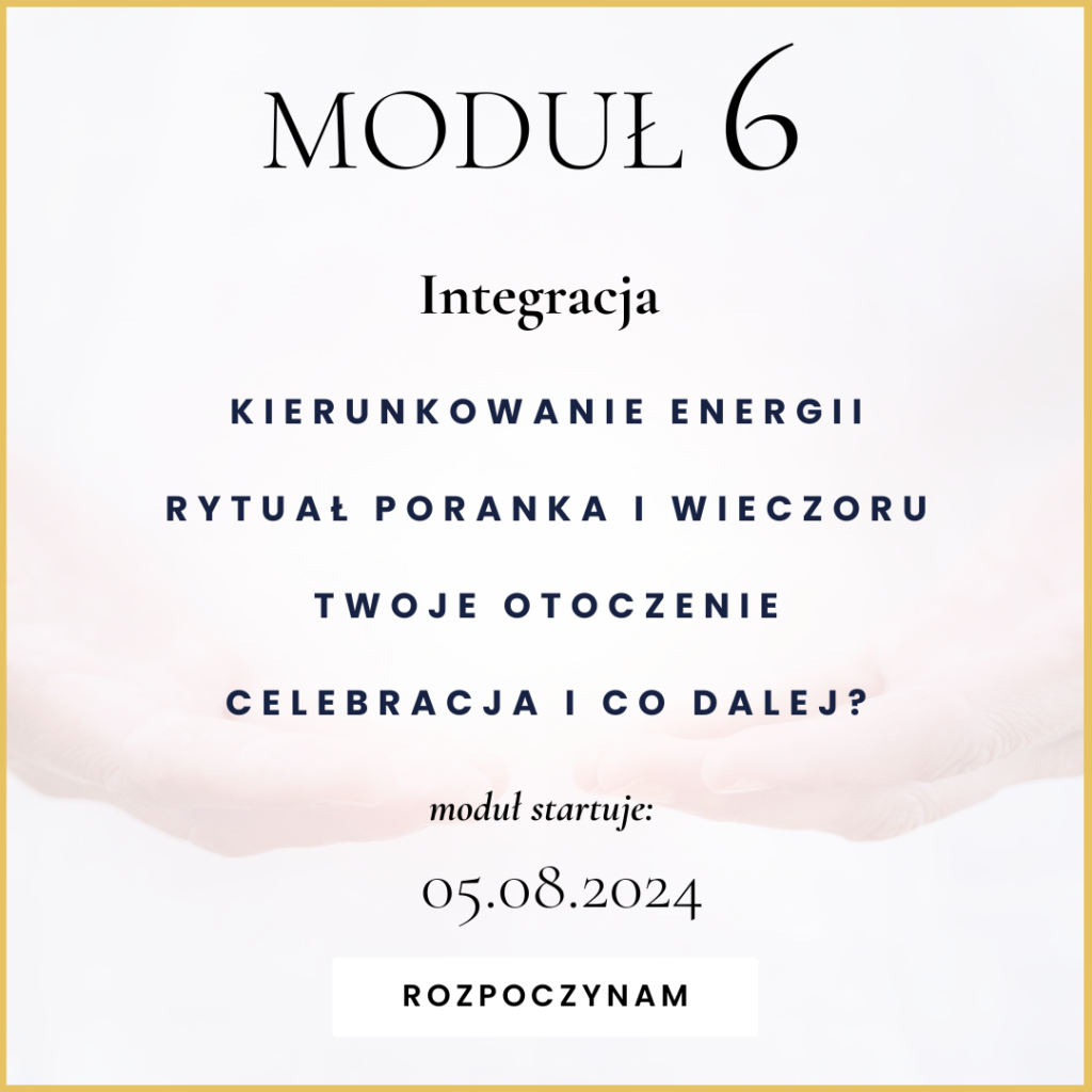 Na tym etapie, tuż przed celebracją ukończenia kursu, zajmiemy się integracją zmian, które zaszły w Tobie przez ostatnie 5 tygodni. Nauczysz się kierunkować swoją energię po kursie oraz stworzysz harmonijne nawyki, które prowadzą Cię tam, gdzie chcesz, a nie tam gdzie „trzeba”, „wypada” i w inne nieciekawe miejsca.